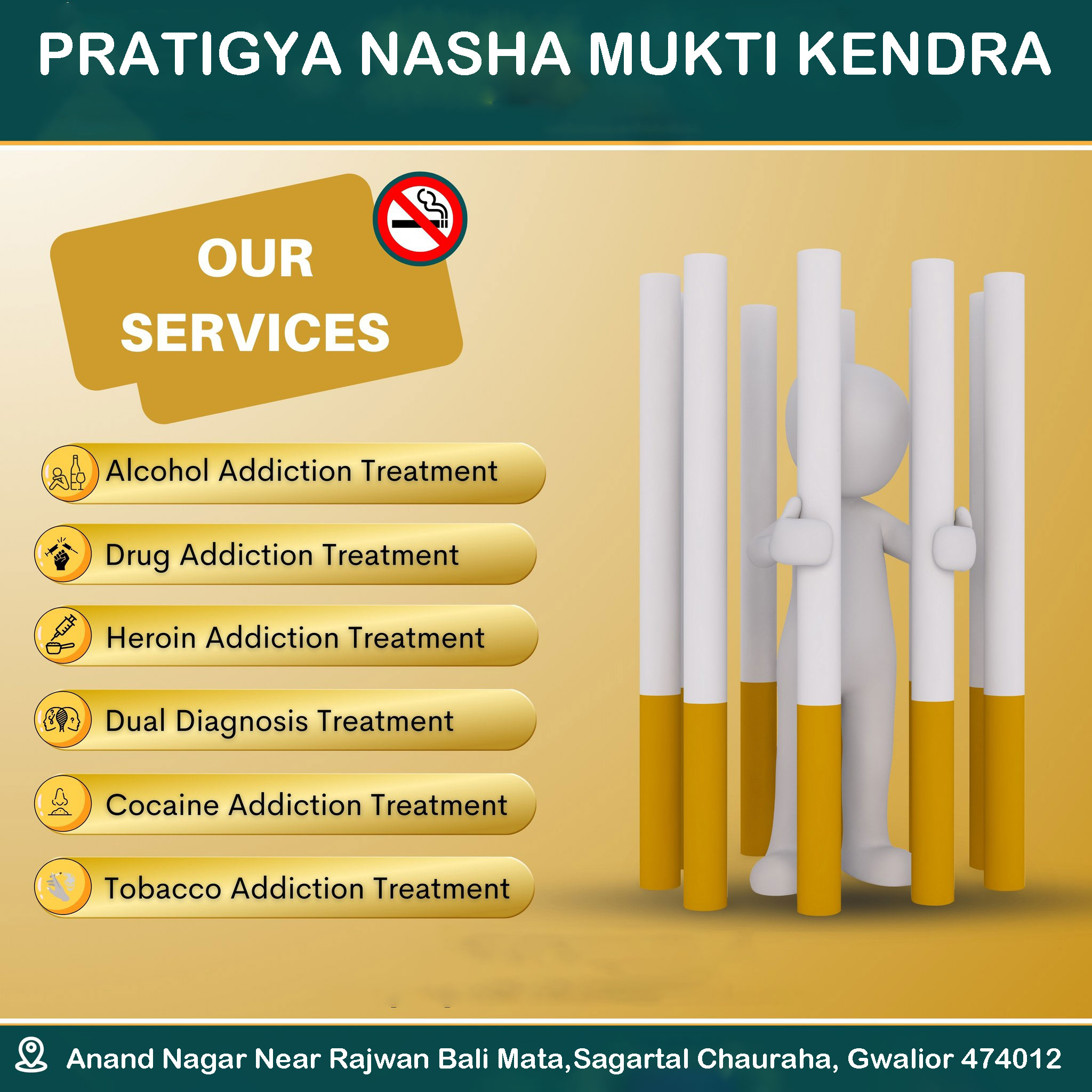 Pratigya de addiction centre is a renowned rehabilitation centre in Gwalior. Our unwavering dedication is directed towards the profound transformation of lives ensnared by addiction. At our core, we aim to combat the deeply entrenched stigma associated with addiction while offering unwavering support to those in dire need. Since our inception, we have tirelessly pursued the goal of illuminating the path to recovery for countless individuals and families.